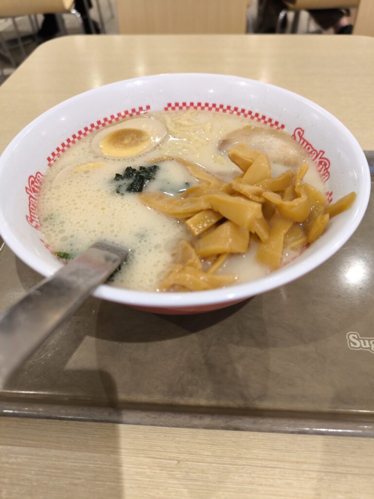 先日、スガキヤに行って実際に食べてみた時の写真です。圧倒的なメンマの存在感がたまらないですね。
